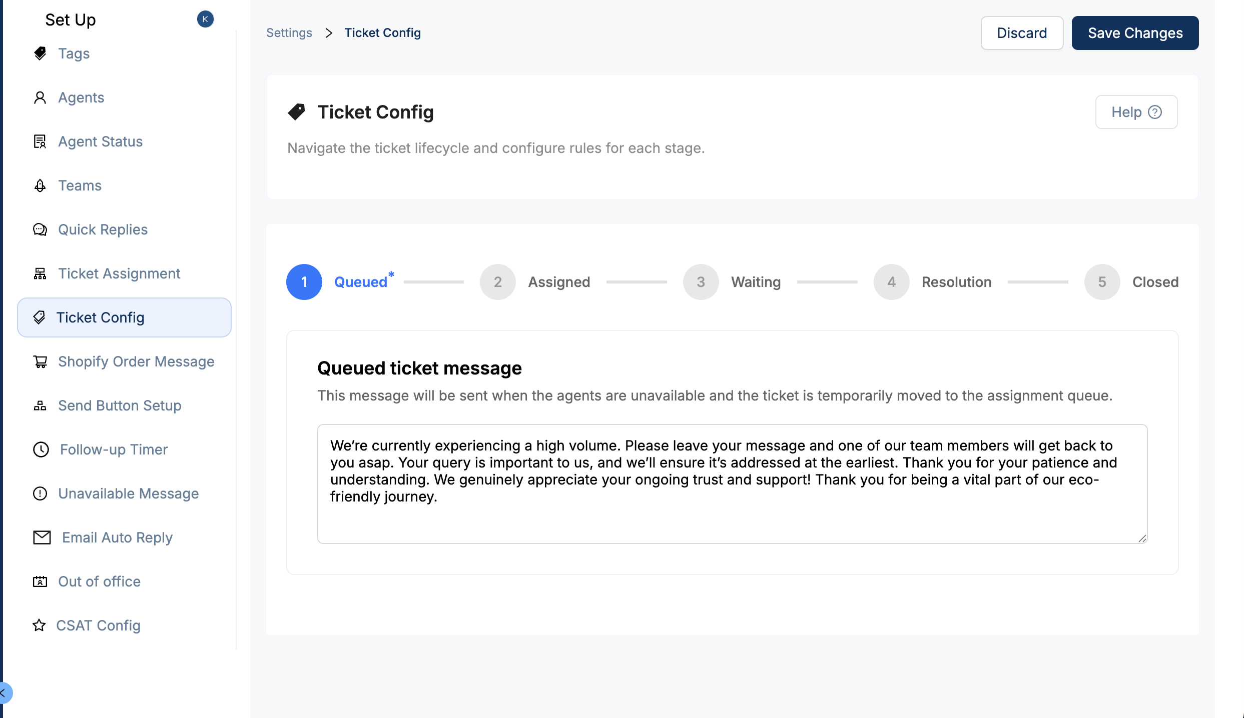 When a ticket is created but no agent is immediately available, queued ticket settings determine what the customer sees and experiences.