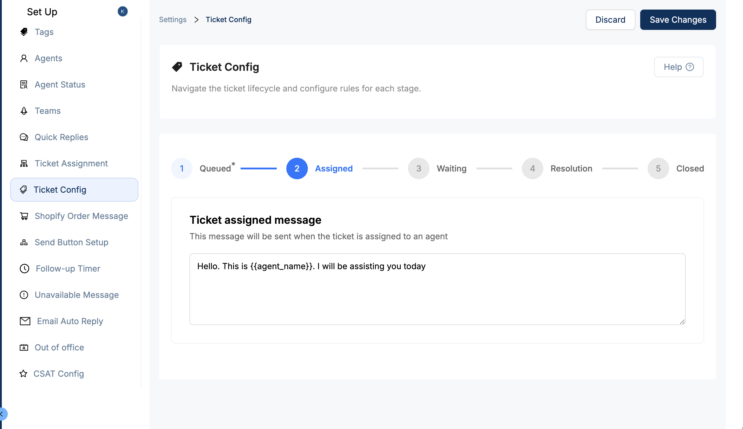 This is the message your customer receives when an agent is assigned to their ticket — a confirmation that the conversation is now being actively handled.
