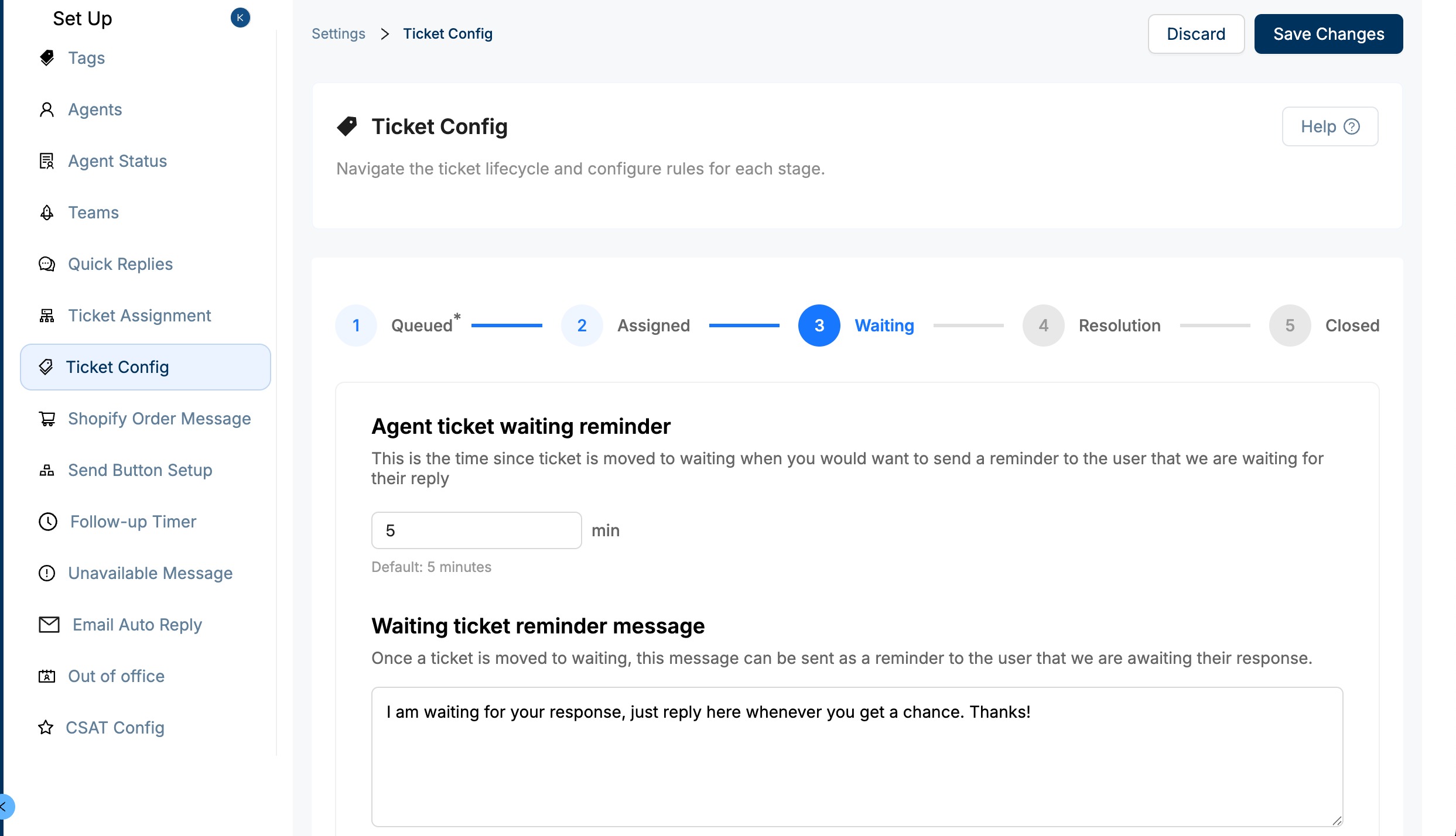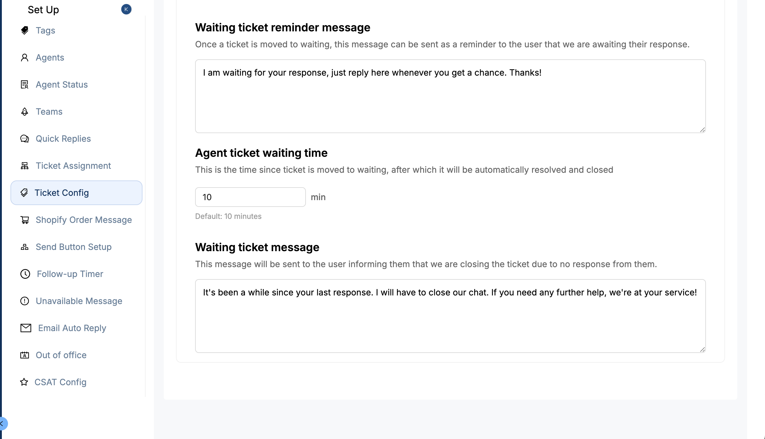You can set a timer (default: 5 mins) that triggers a friendly nudge message asking the customer to reply.Waiting Ticket Reminder Message