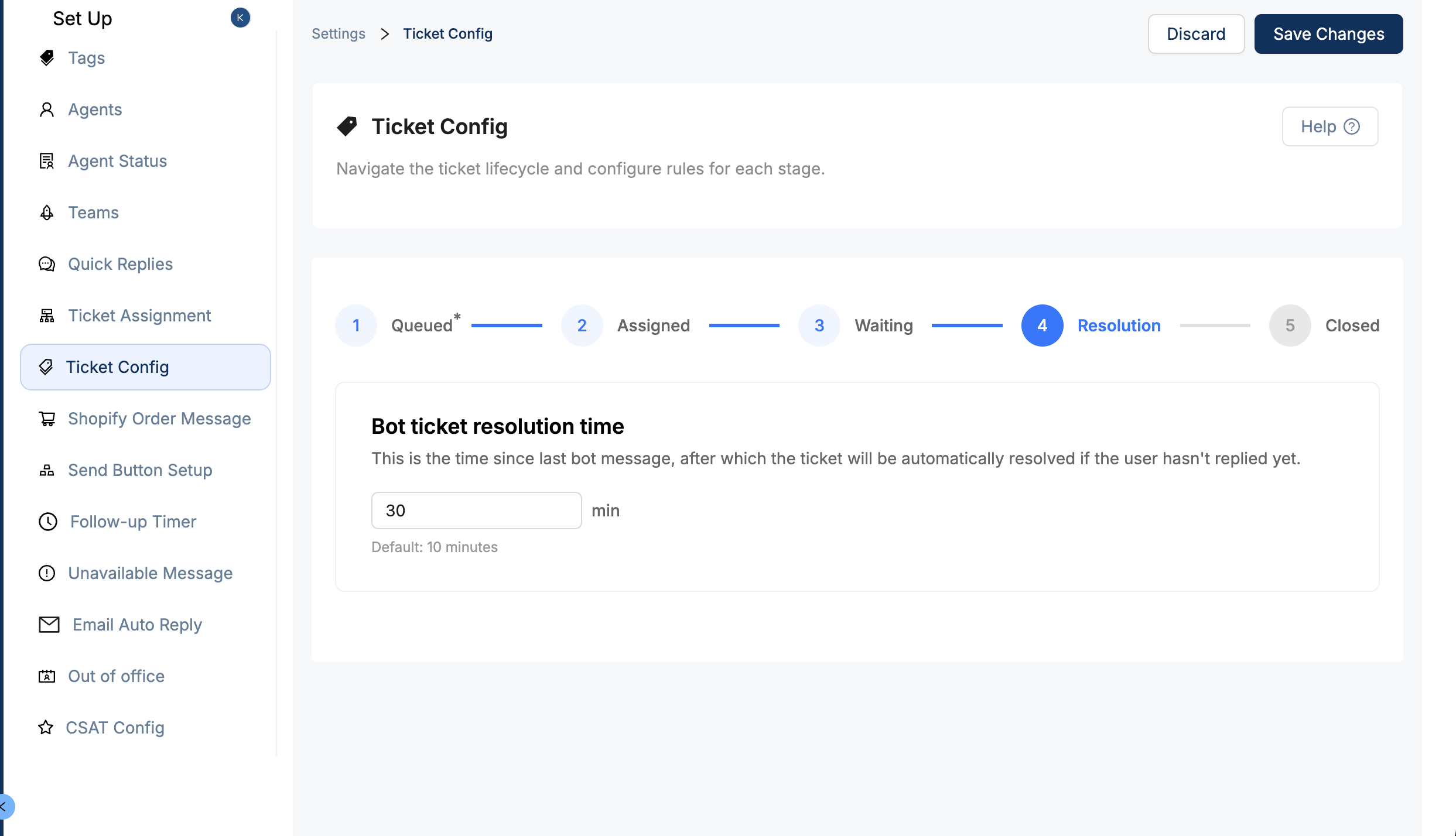 This opens the configuration panel where you control automated messaging, ticket timers, and resolution behaviour.