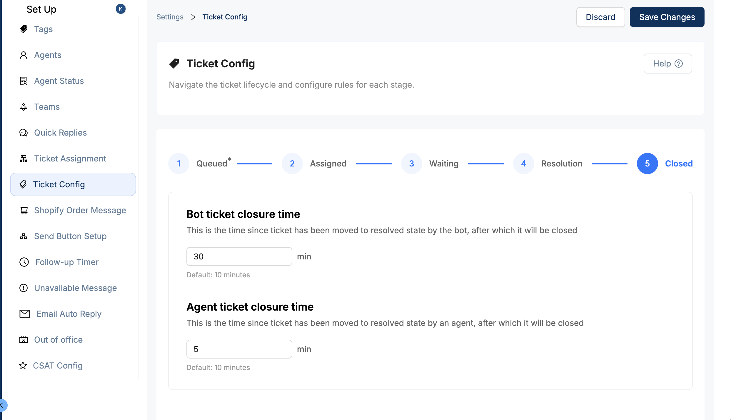 Time for closure for both bot resolved and agent resolved tickets can be managed from here