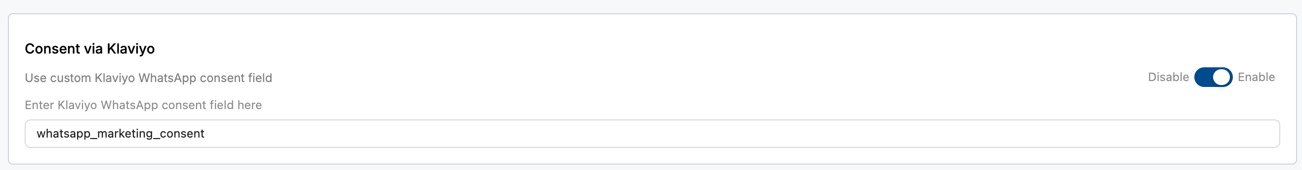 2. Enable Klaviyo custom field and add the name of the consent field. We suggest whatsapp_marketing_consent