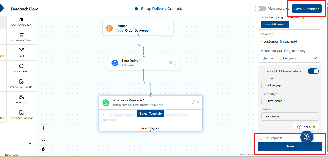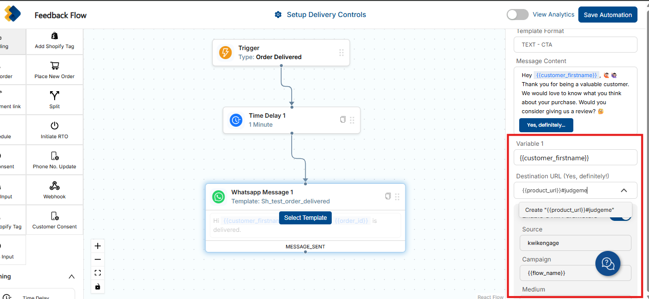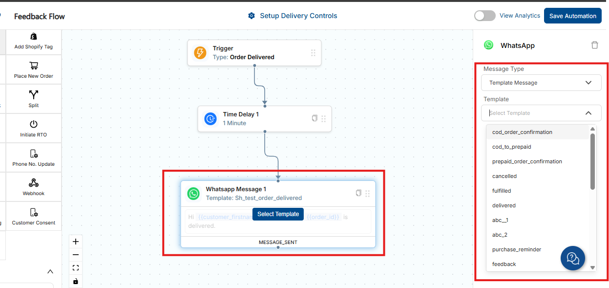 Insert a Time Delay block between the Trigger and WhatsApp blocks