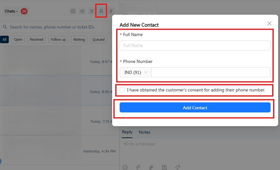 Yes, you can manually add a contact from the Chat section (Inbox) by clicking on the add contact icon and filling in the required details (as shown in the screenshot).
